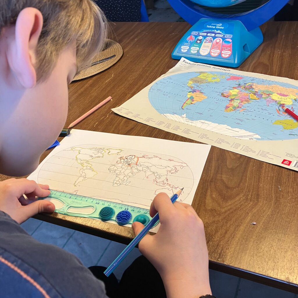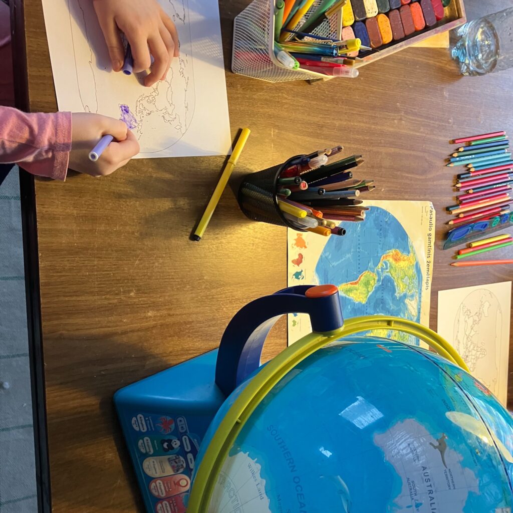 Prieš paleidžiant įrašą, paprašiau vaikų pasižymėti kokius miestus ar šalis jie išgirs. Vėliau ieškojome jų gaublyje, žymėjome savo žemėlapiuose.
