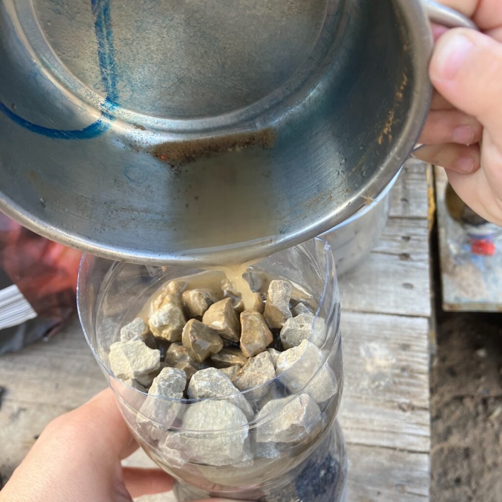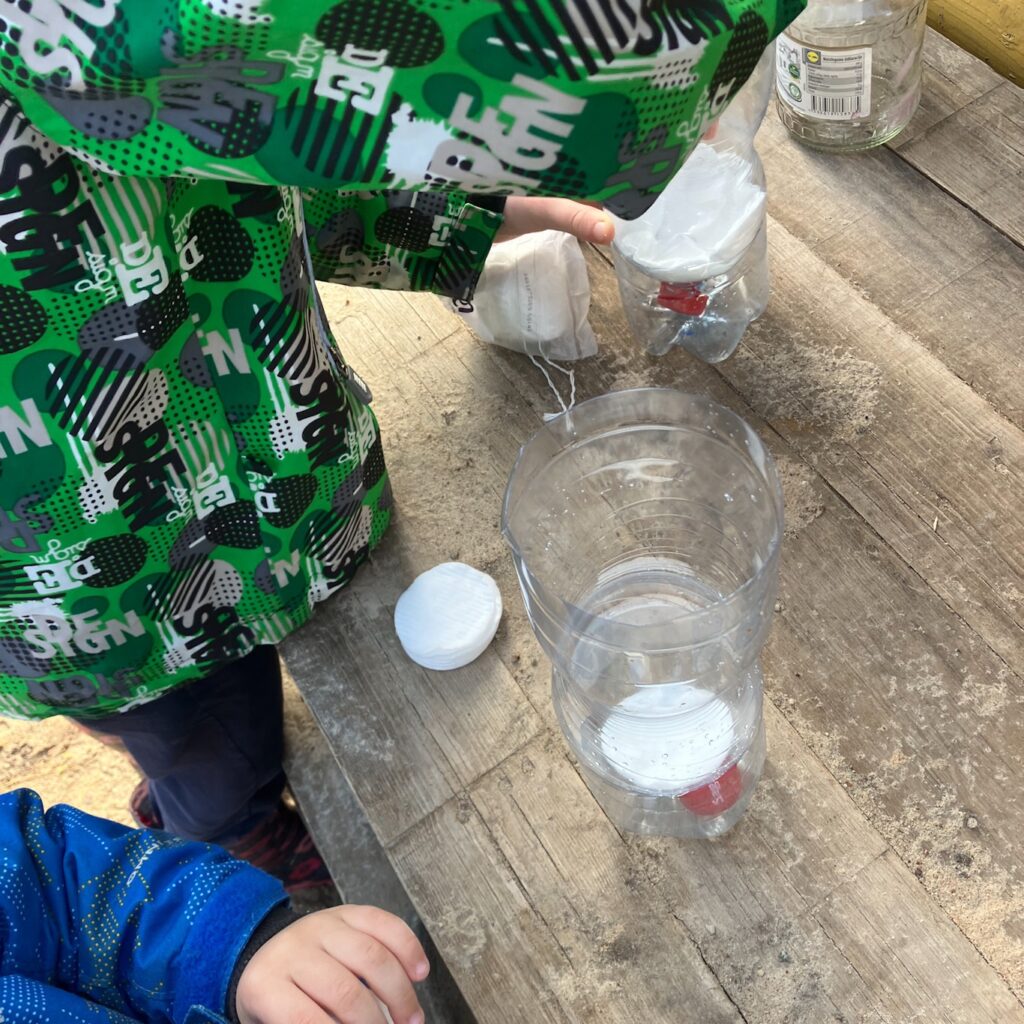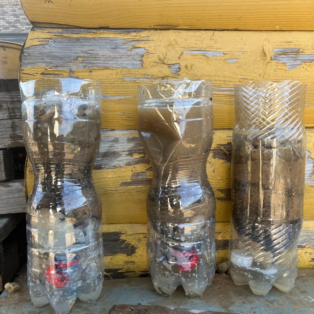 Reikia plastikinio butelio, jam nupjovėme dugną. Kur yra kakliukas sluoksniuojame: vatos diskeliai, anglis, smėlis, žvyras, smėlis ir akmenukai.