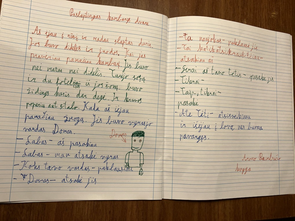 O svarbiausias atradimas – skaitymo poveikis. Akivaizdžiai pajutau, kaip vaikas, dar ketvirtoje klasėje, mėdžioja skyrybą, dialogo formas, net teksto pateikimą – tarsi iš knygos. Atsiranda net tokie pavadinimai, kaip knygose – „Ištrauka iš mano knygos apie…“