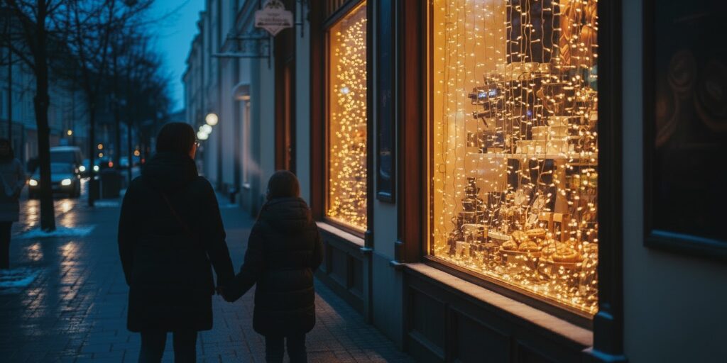 Su dukra eidamos pro jaukią kavinukę, nenuleidome akių, kol už mūsų neišniro kito pastato tamsūs langai.