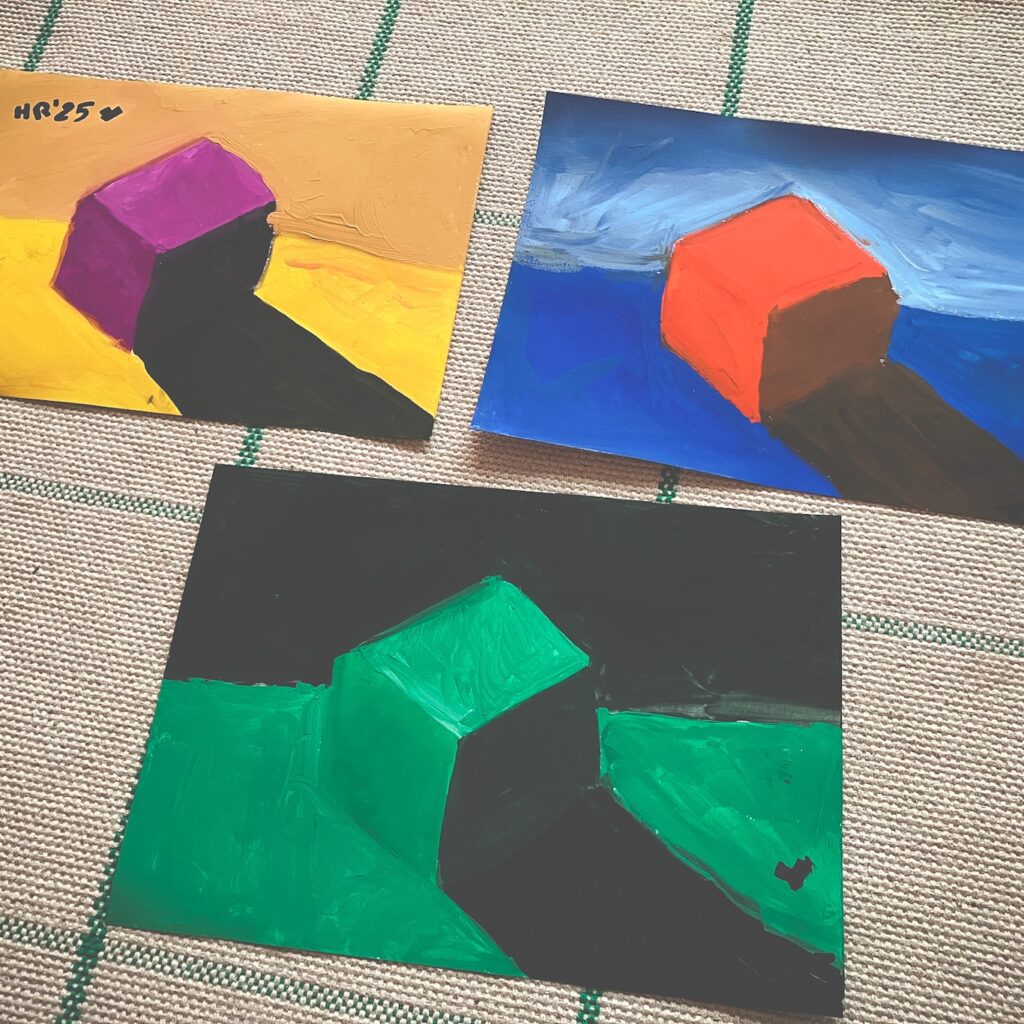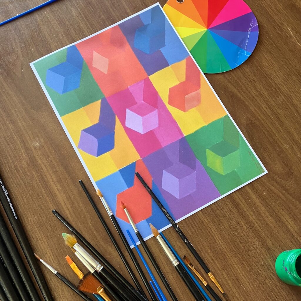 15. Praktinė užduotis: nutapyti du kubus fone, pasirenkant a) vieną spalvą ir jos atspalvius; b) pasirenkant spalvų rate priešines spalvas.
