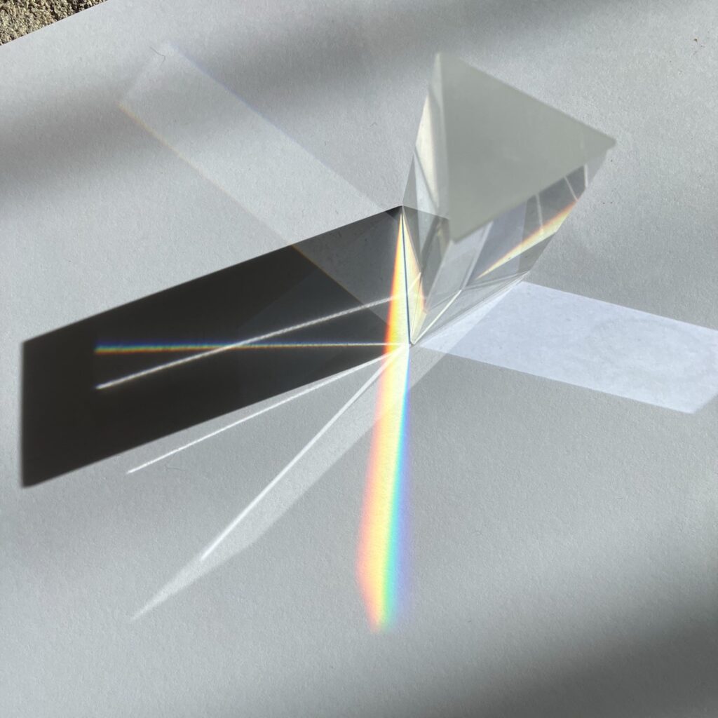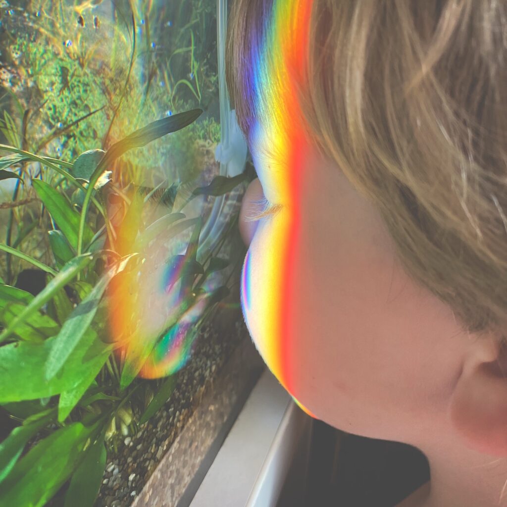 - Kas yra spalva / Kaip mes ją matome – įvadas į spalvų suvokimą (kelios nuotraukos kaip paviršiai vienas spalvas sugeria, kitas atspindi (color physics simple kids); kaip dailininkai išskaidė baltą šviesos spindulį į spalvas, matosi vaivorykštė (color prism); kaip atsiranda vaivorykstė). Patys atlikome bandymą su stiklo prizme, kaip tik saulė nušvietė ir pro akvariumo kampą, buvo smagu, kad tai papildė pamoką.
