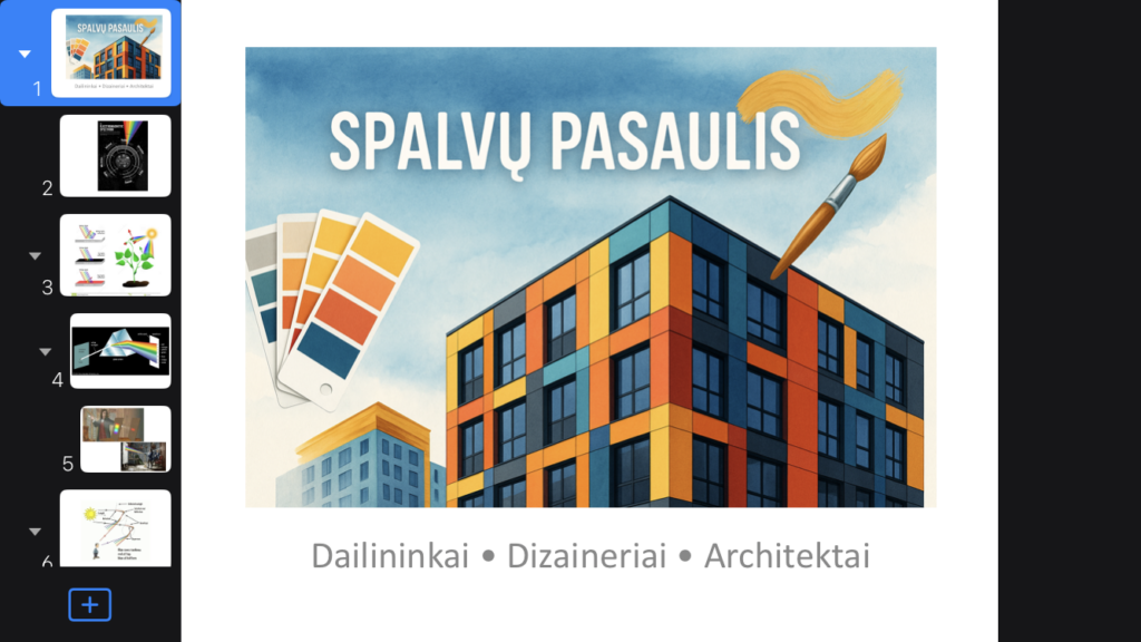 - Dailininkai • Dizaineriai • Architektai – kas kuria ir naudoja spalvas (trumpa įžanga, kad mus supa ne tik spalvos iš gamtos, bet jas stengiasi atkartoti ir žmonės).