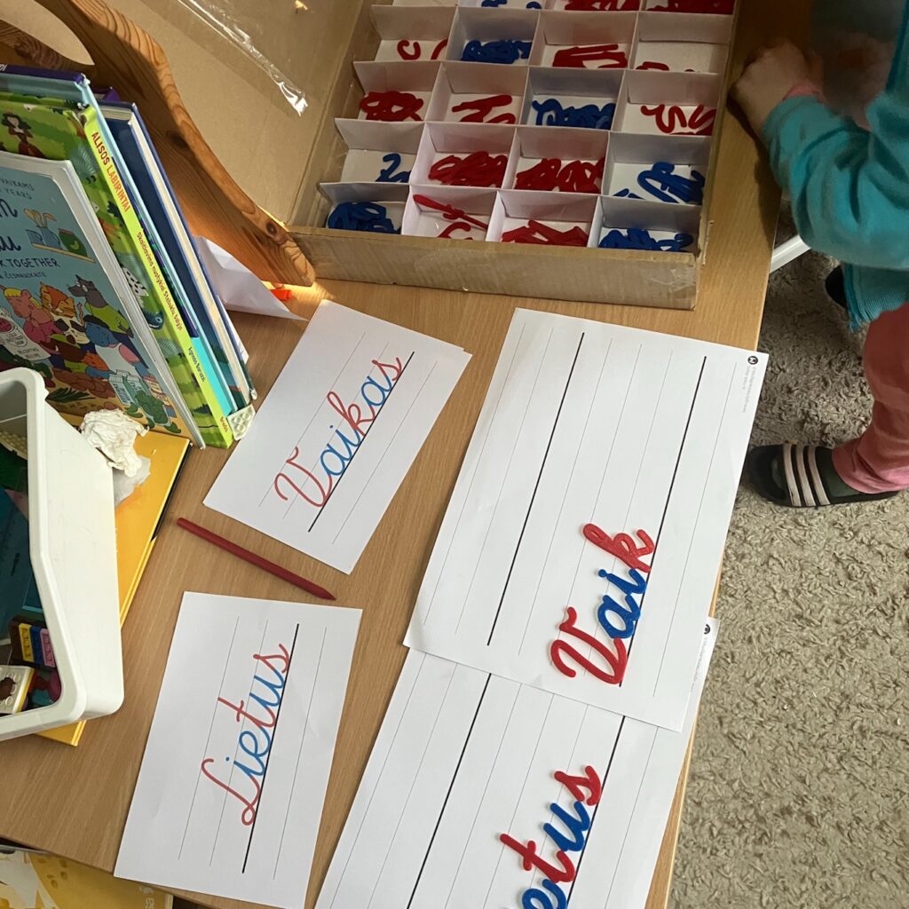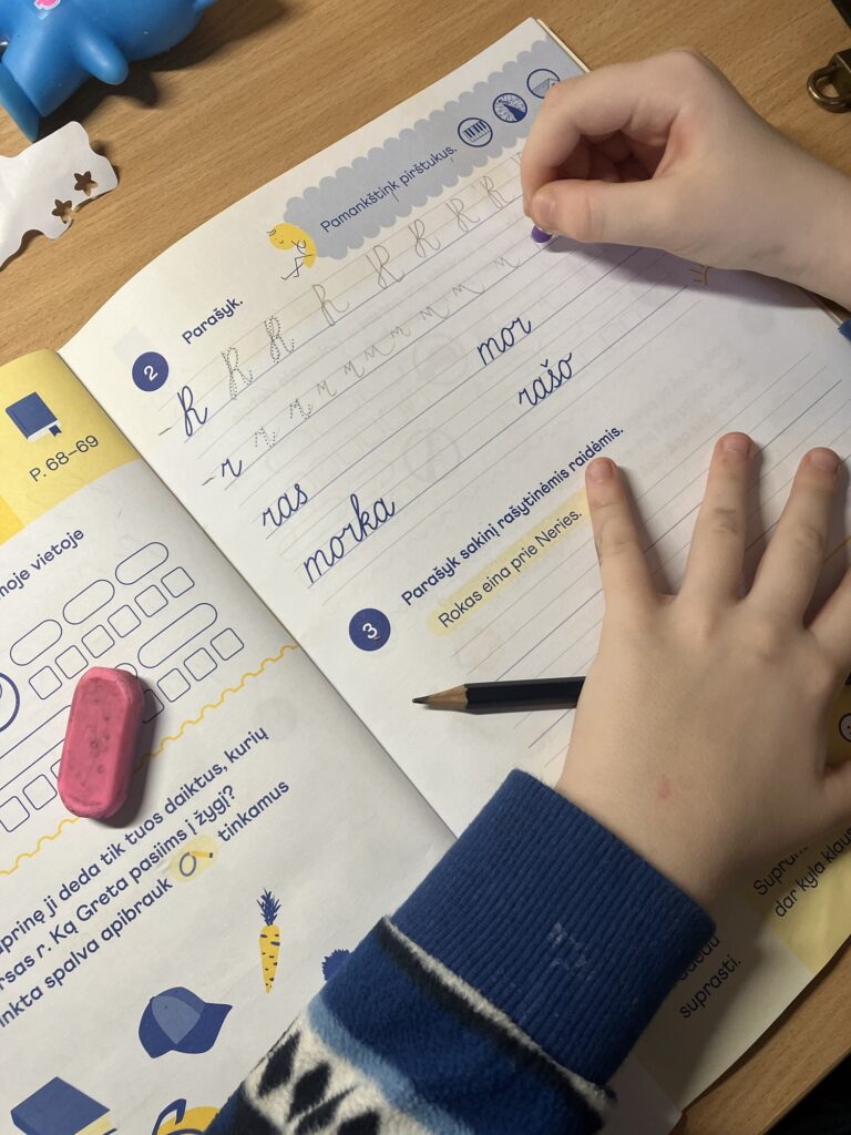Su pirmoke mes tris kartus per savaitę turime rašymo pamokas (susipažįstame su dailyraščiu). Nereikalauju rašyti po puslapį tų pačių raidžių. Pagal jos charakterį, ji to nedarys. Gudrauju. Kartais raides rašome smėlyje, kartais prašau sukurti kokią istoriją ir bent vieną žodį parašyti rašytinėmis raidėmis. Būna – aš rašau, o ji tik stebi. Neprašau pakartoti, bet žinau, kad ji įsidėmi. Kai būna pasiruošusi – atkartoja. Bet savo tempu.