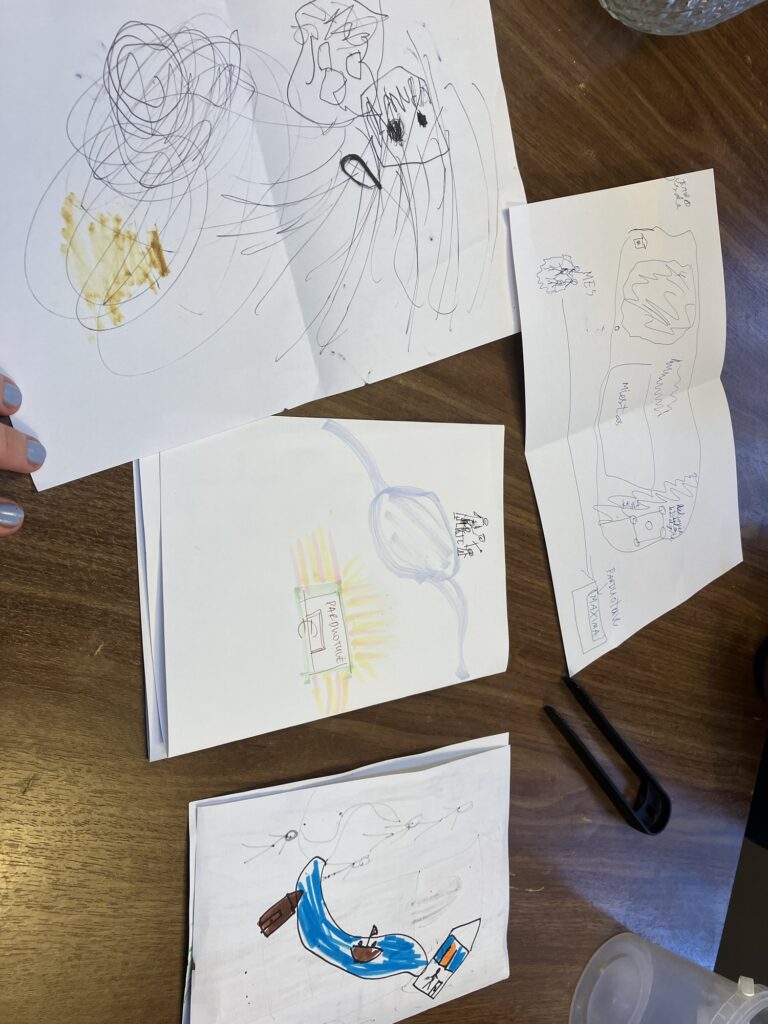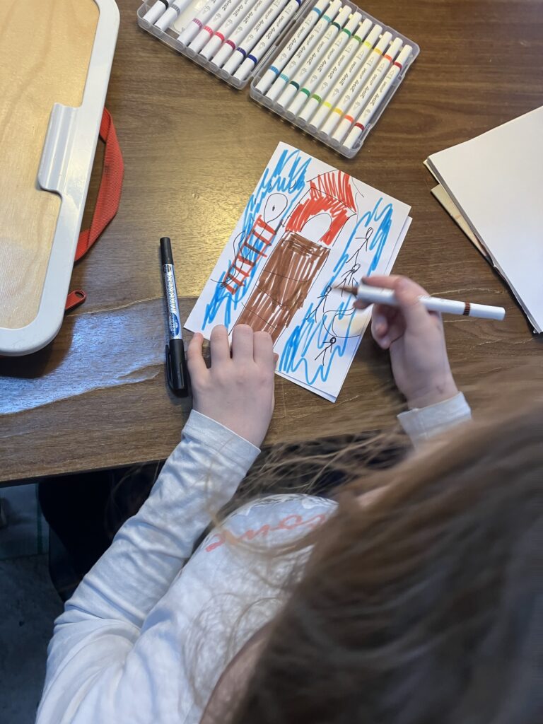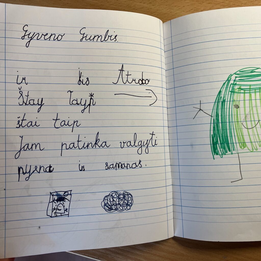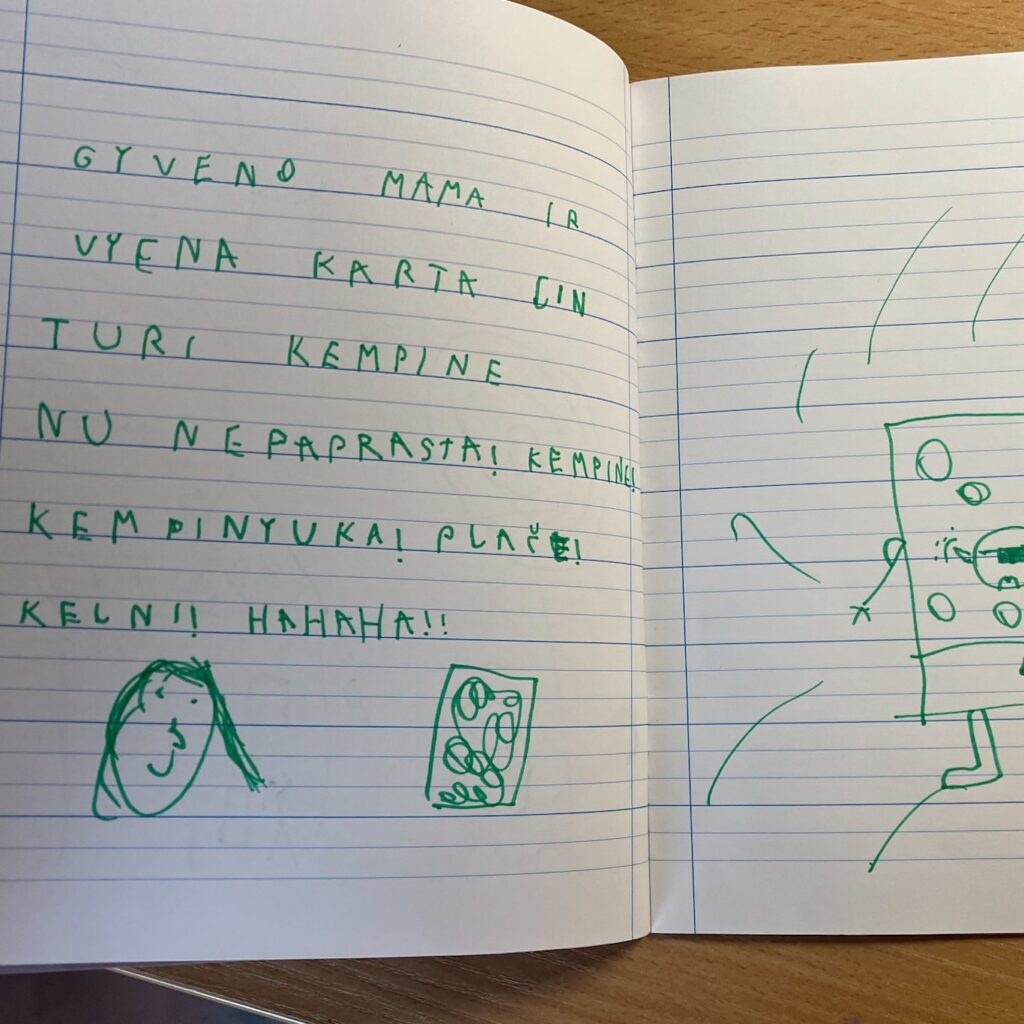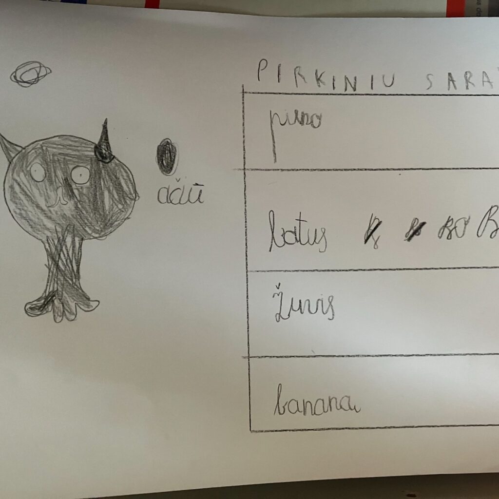 Tai taip mes po truputį integruojame lietuvių kalbos rašybą. Su kūryba… na, pasisekė, nes vaikas turi be galo lakią vaizduotę. Tada tenka sukti galvą kaip ją nukreipti, mat užduotys vadovėlyje nepatenkina šio poreikio. Tad mes jungiame piešimą su rašymu (komiksai, atvirutės, kvietimai, laiškai). Nevarżau žaidimų, o dabar jų atsiranda vis įdomesnių, nes mokame skaityti ir rašyti! Tai leidżia kurti slaptus kodus, rašyti žinutes broliui, palikti staigmenas tėvams ir pan. Kokia istoriją neseniai mano garbiai sukūrė (gramatikos klaidų netaisau, kai vaikas tiesiog nori atsipalaiduoti kurdamas):