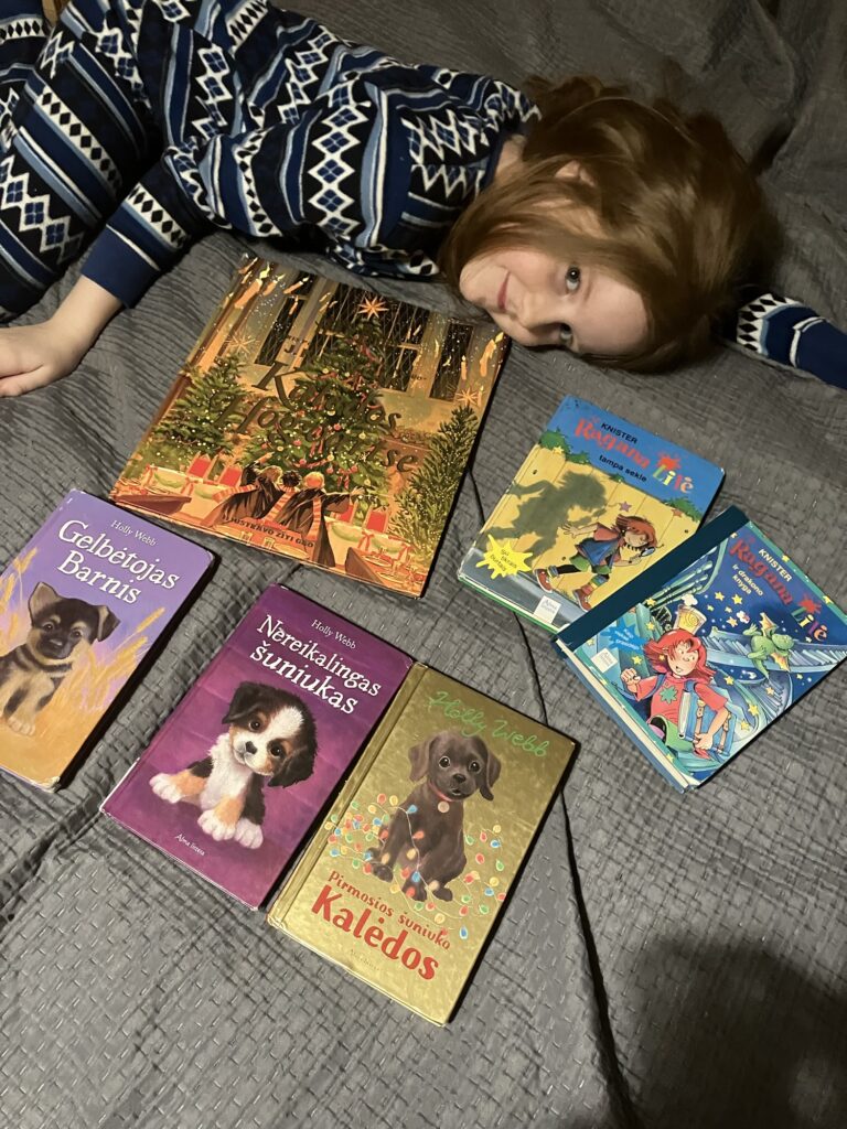 Su pirmoke mes skaitome tai kartu, tai ji pati varto, paskaitinėja. Labiausiai jai patiko Holly Webb serija apie kačiukus ir šuniukus… Lengvai skaitosi 🙂 Mėgsta ir pažintines knygas, kartais sudėtingesnio siužeto, kaip ,,Mergaitė su šautuvu”. Keletas knygelių, kurios pamilo mūsų lentynas: