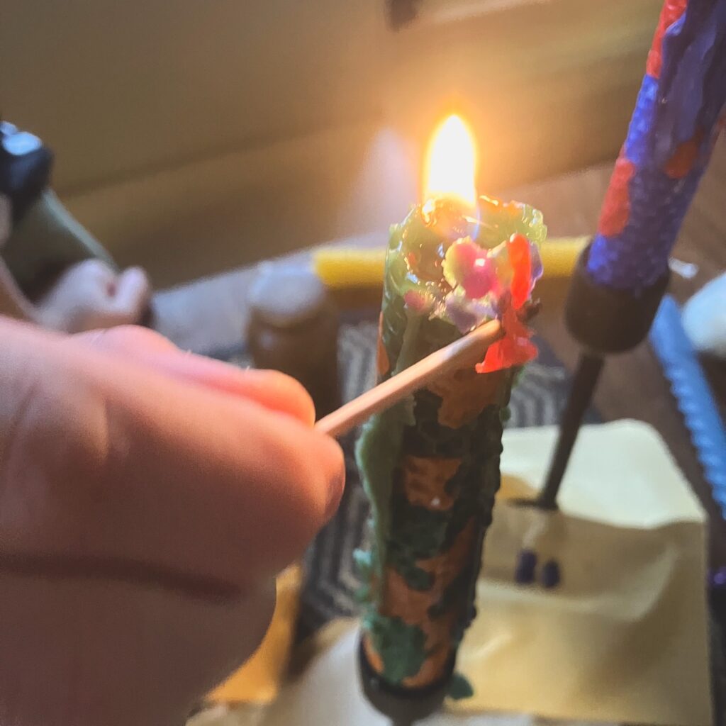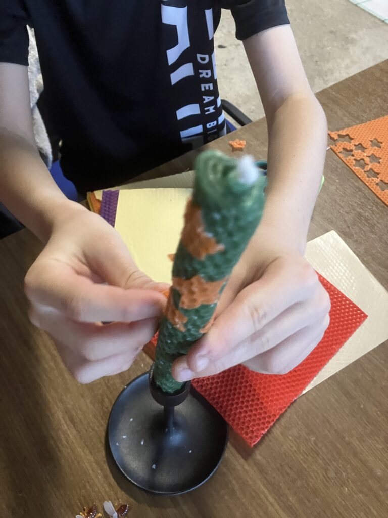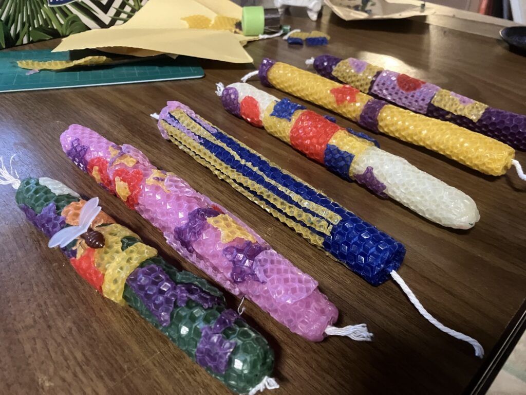 Šiandien su vaikais pasigaminome bičių vaško žvakes iš paprasto „Beeswax Candle Making Kit“. Procesas labai ramus ir maloniai rankomis jaučiamas: išsirinkome spalvotas vaško plokšteles, įdėjome specialų suūlą ir atsargiai susukome į tvirtas žvakutes.
